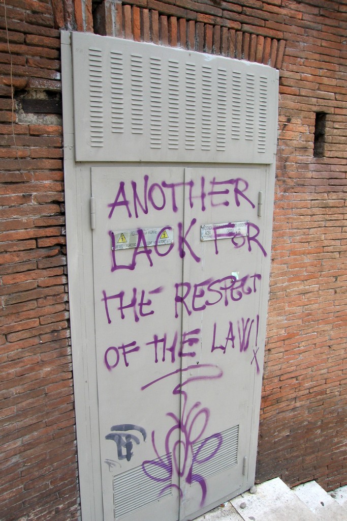 Dziś jest ciepło ale pochmurnie. Pyszna kawa w małej knajpce, na ścianach plakaty ze starych filmów, klimatycznie. Potem pod Koloseum tamtejsza policja czepia się nas dość agresywnie o kopanie kawałka kolumny leżącego na chodniku i w zasadzie nie wiadomo o co chodzi. W sam raz na poprawienie nastroju pojawia się grafitti: